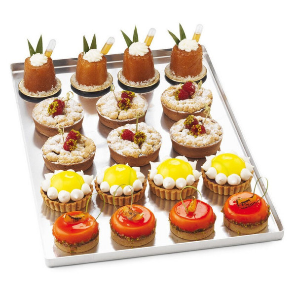 Rectangular cake pan with removable bottom in stainless steel, made in France by De Buyer.